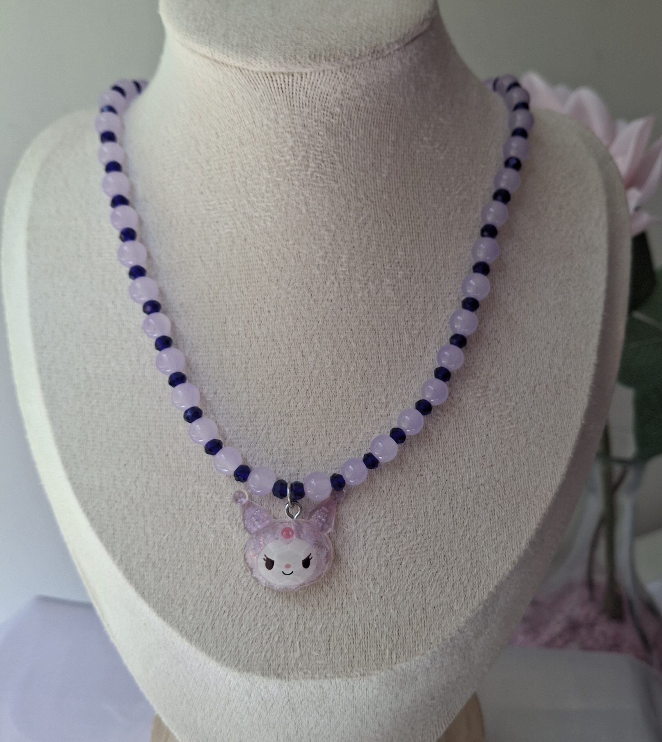 El Collar Kuromi de perlas moras y lilas es un accesorio femenino, delicado y original. Ideal para completar looks kawaii, aesthetic o casuales con un toque tierno y diferente.