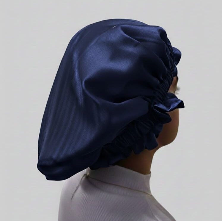 Gorro en satín color azul oscuro, suave y cómodo, ideal para proteger tu cabello mientras duermes. Ayuda a mantener el peinado y reducir el frizz.